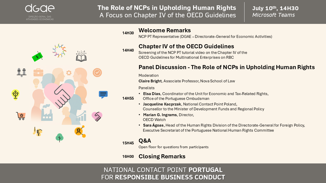 No próximo dia 10 de julho de 2025, o Ponto de Contacto Nacional Português para a Conduta Empresarial Responsável (PCN PT) irá realizar um workshop online dedicado ao Capítulo IV “Direitos Humanos” das Diretrizes da OCDE para Empresas Multinacionais sobre Conduta Empresarial Responsável (CER), com o objetivo de promover a reflexão e o diálogo entre diferentes entidades sobre o papel dos PCN na promoção e defesa dos Direitos Humanos.