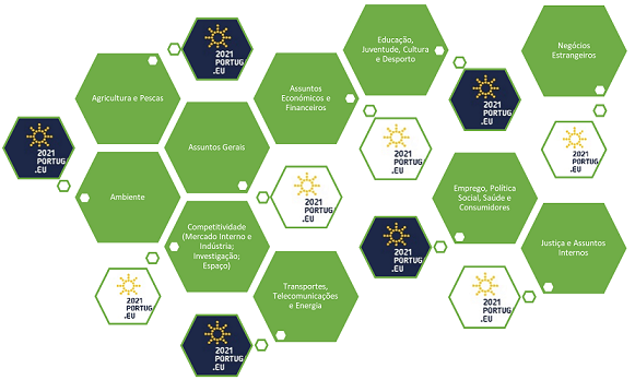 Existem 10 formações diferentes, onde os Estados-Membros são representados pelos Ministros ou Secretários de Estado da área relevante, consoante o assunto a tratar: