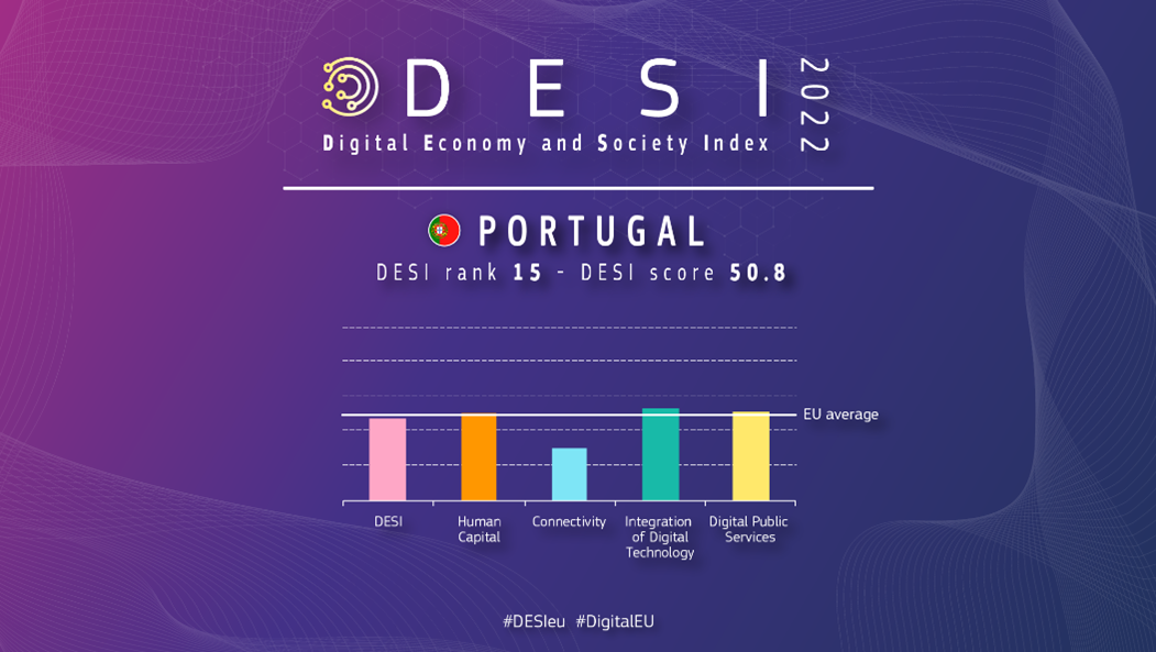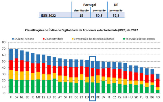Na edição de 2022 do índice de Digitalidade da Economia e Sociedade (IDES), Portugal ocupa o 15.º lugar entre os 27 Estados-Membros da UE, tendo subido uma posição em relação a 2021. Os progressos relativos de Portugal são, de modo geral, ligeiramente inferiores aos dos países homólogos, pelo que há margem para o país acelerar os seus esforços de digitalização.