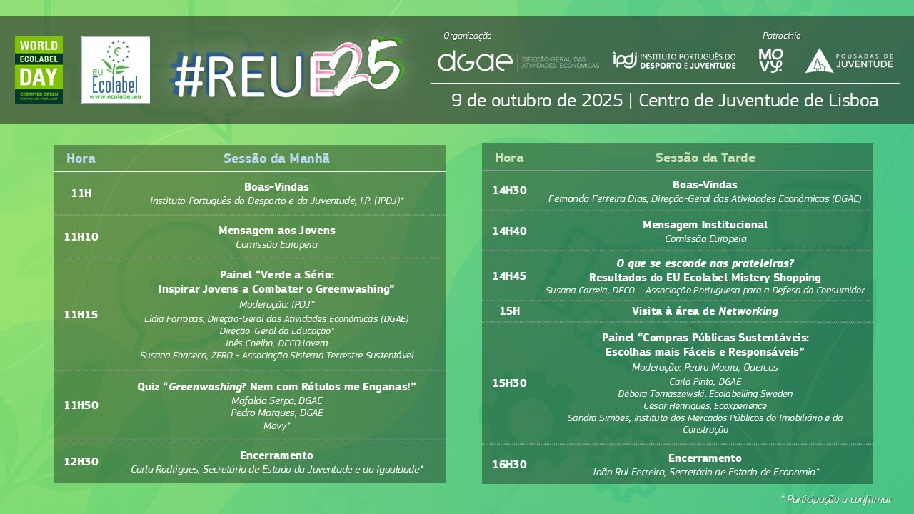 A celebração do Dia Mundial dos Rótulos Ecológicos (World Ecolabel Day), assinalada este ano no dia 9 de outubro de 2025 em mais de 60 países, será assinalada em Portugal pela realização do evento #REUE25 – Porquê escolher o REUE?, no Centro de Juventude de Lisboa. Trata-se do primeiro evento presencial do Rótulo Ecológico da União Europeia (REUE) em Portugal nesta década, organizado pela Direção-Geral das Atividades Económicas (DGAE) em parceria com o Instituto Português do Desporto e da Juventude, I.P. (IPDJ) e com o patrocínio da Movy e das Pousadas da Juventude. Este evento constitui o ponto alto da agenda nacional dedicada ao REUE em 2025.