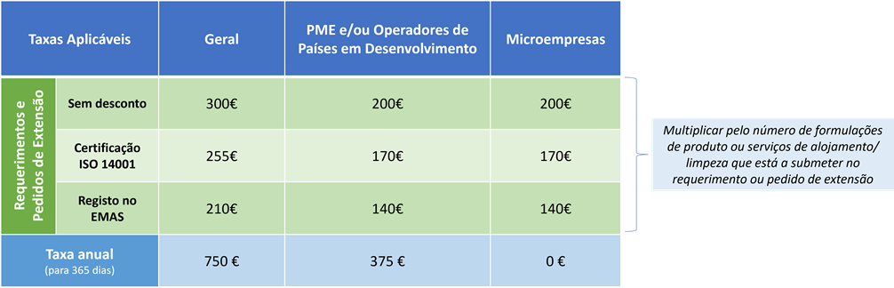 Para mais informações sobre taxas, consulte a página Como solicitar o rótulo ecológico da UE no sítio Web da Comissão Europeia.